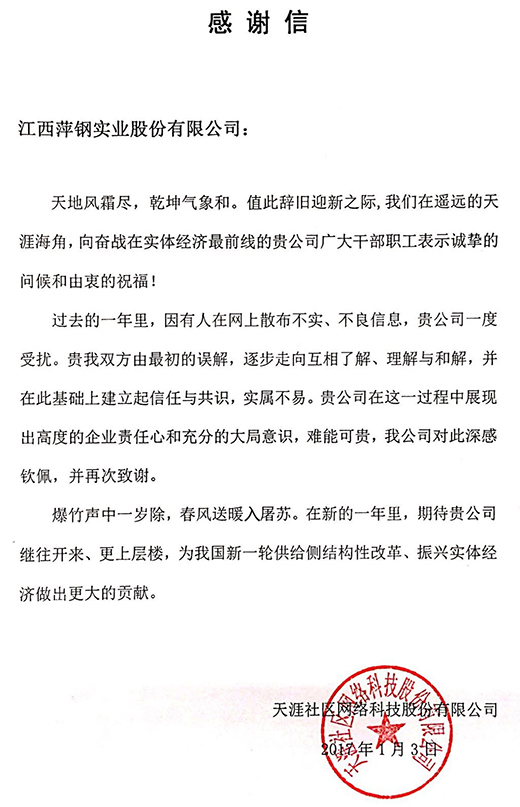 天涯社区网络科技股份有限公����� �������Ƴ������������ �������Ƴ�������司致方大萍钢的感谢信
